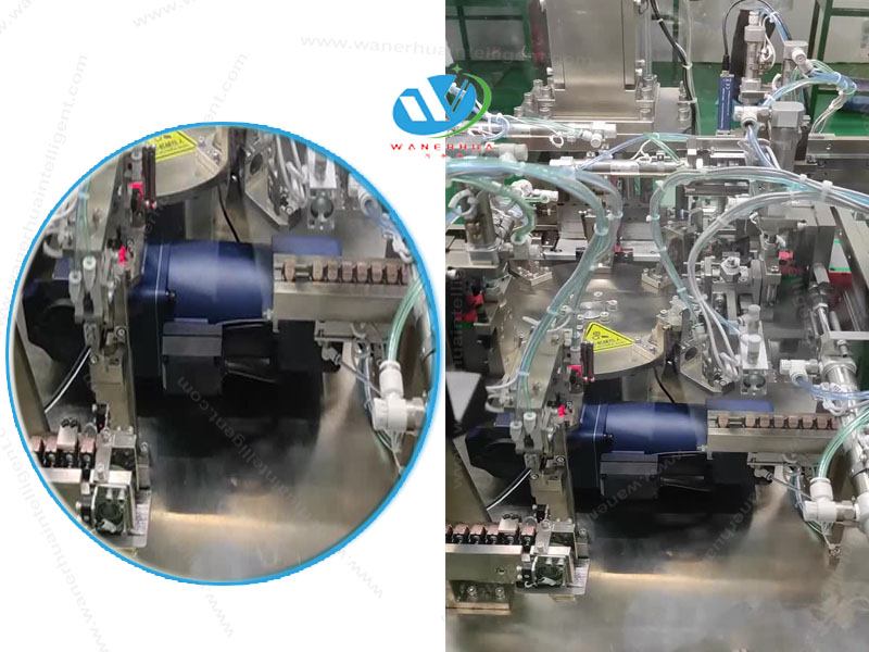 4、Fully automatic feeding and assembling. Automatic riveting, AB foot assembling, reed loading, electrical inspection, dust removal shell, laser marking, and collect plates. Auto-start / stop when there is material (or no material) detected. Detect parts presence, the good products and NG products will be unloaded separately.